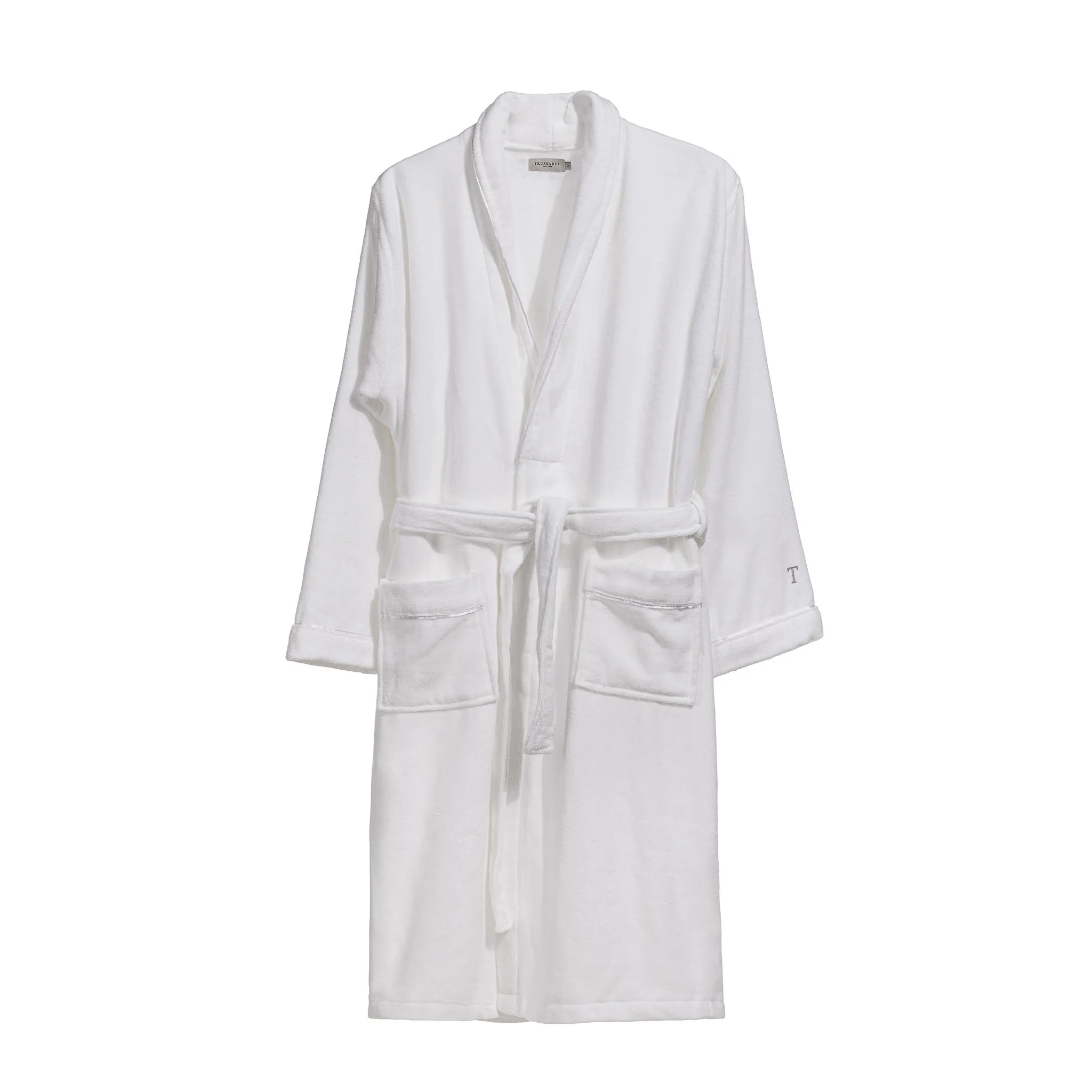 Os roupões Trussardi são mais que vestimenta; são convite ao conforto e ao aconchego. Feitos de algodão com tecnologia Cottone Speciale, o roupão Barone oferece sensação envolvente. Nova modelagem e atenção aos detalhes, bordado do “T” nas mangas adicionam sofisticação. Com toque aveludado e fibras leves, proporciona caimento impecável, criando ambiente de spa no lar.