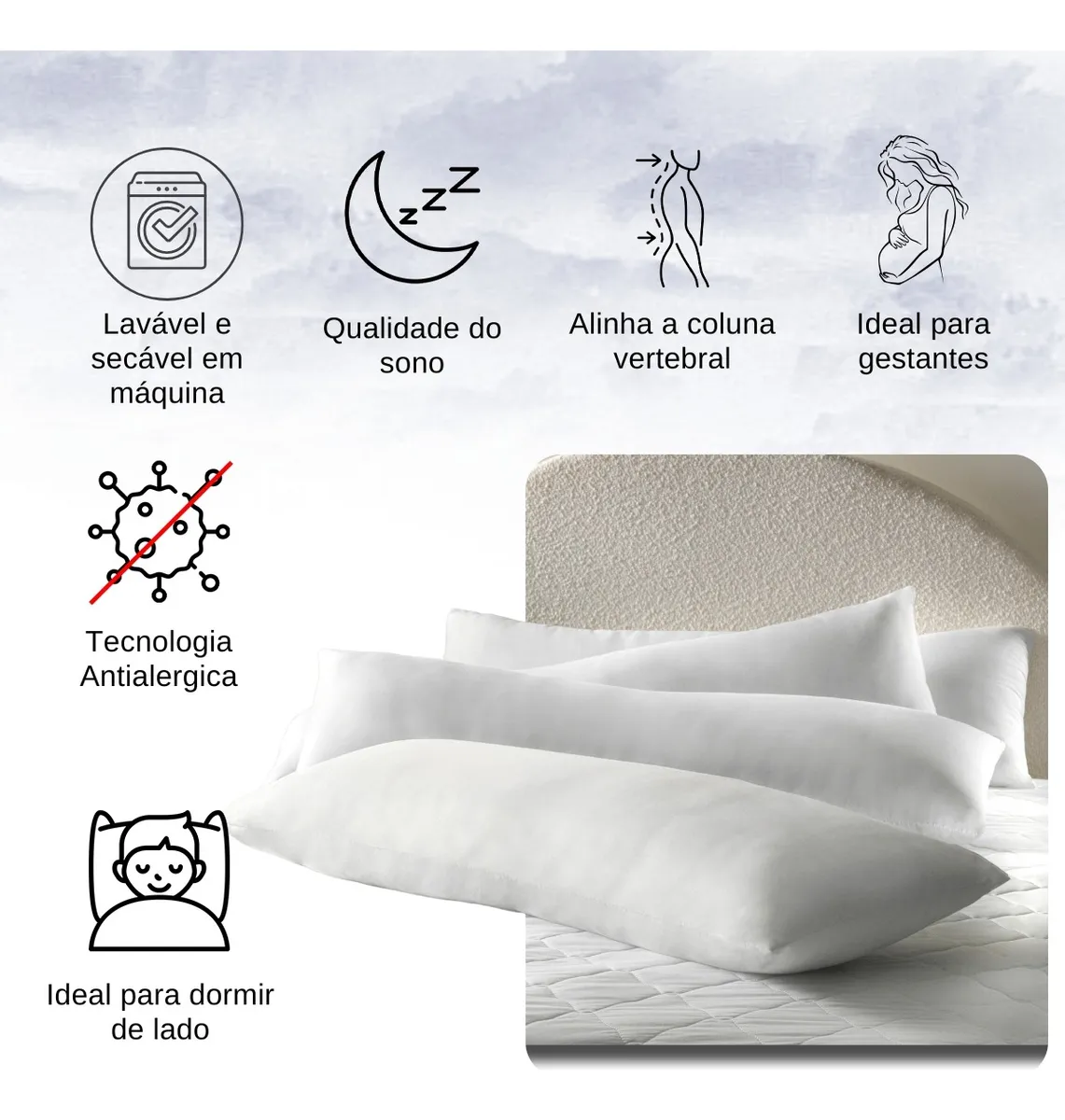 Proporcionando o alinhamento postural, este body pillow mantém a coluna alinhada e apoia o queixo, impedindo a flexão do pescoço. Evita o atrito entre joelhos e tornozelos, e impede que o corpo vire de bruços ou costas. Também é perfeito para gestantes, proporcionando um suporte excelente para a barriga, oferecendo conforto adicional durante a gravidez. Extremamente versátil, é perfeito para o descanso individual e para decorar a cama, além de servir como proteção para as crianças.